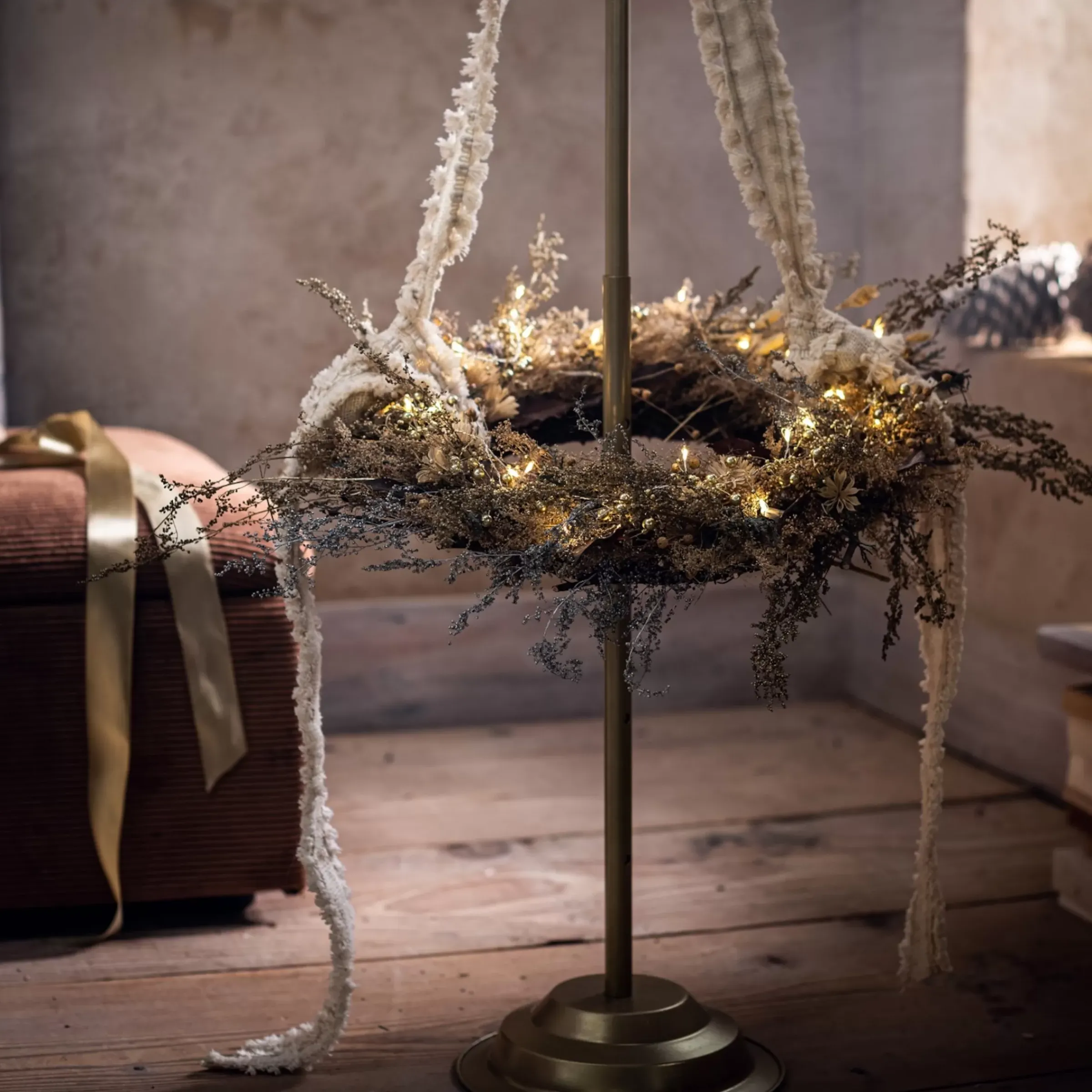 Pourquoi Toujours Suspendre Ou Accrocher Des Couronnes De Fleurs Aux Portes Ou Aux Murs ?A La Maison ? Avec Ce Porte-Couronne, Tu Peux Mettre En Scene Ta Couronne De Maniere Décorative Au Milieu De La Piece Ou A L’Endroit Ou Tu Souhaites La Placer !Grace A Sa Finition Doree, Il Fait De La Couronne Un Point De Mire Glamour. Le Support De Couronne Est Reglable En Hauteur Sur Quatre Niveaux.